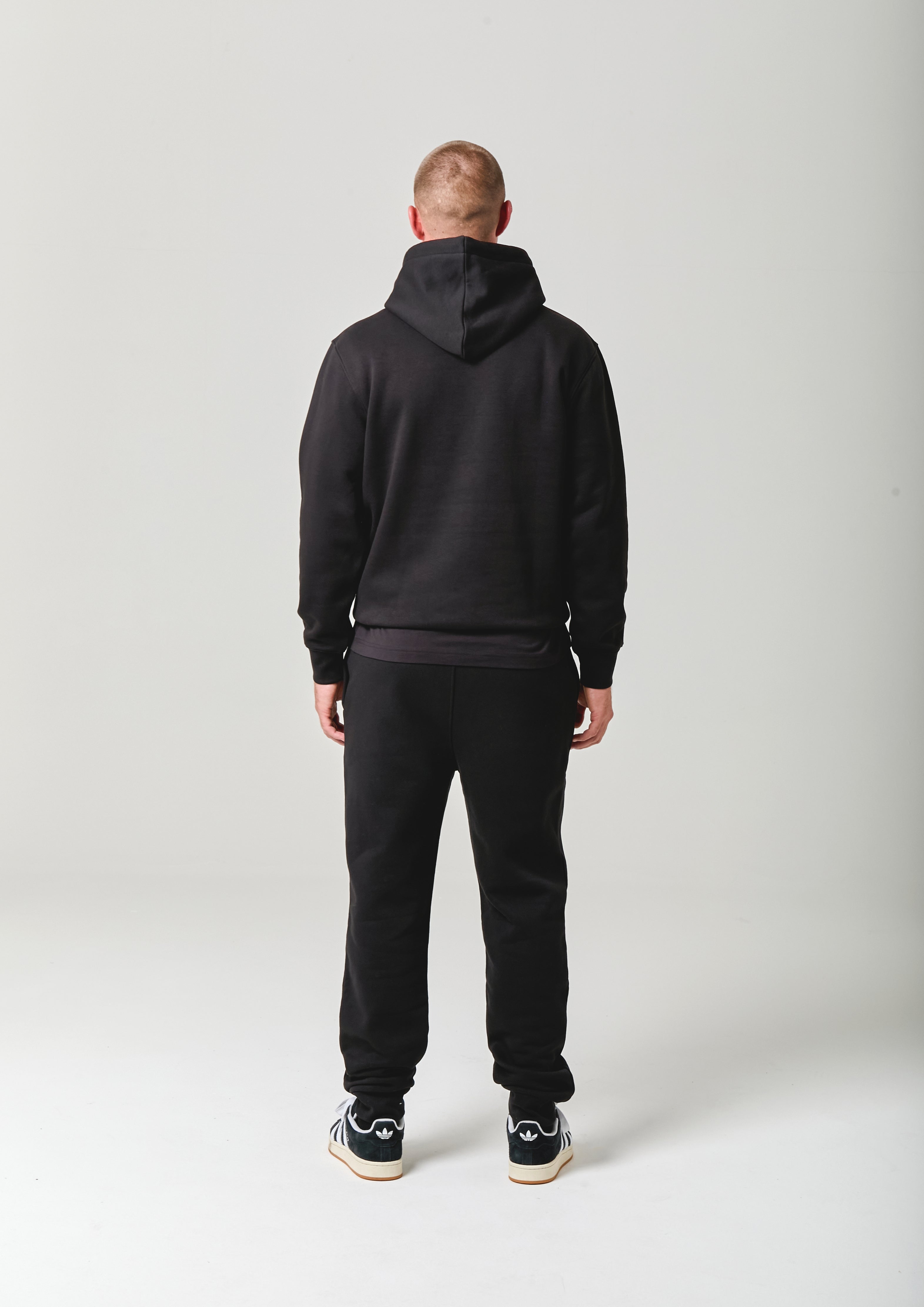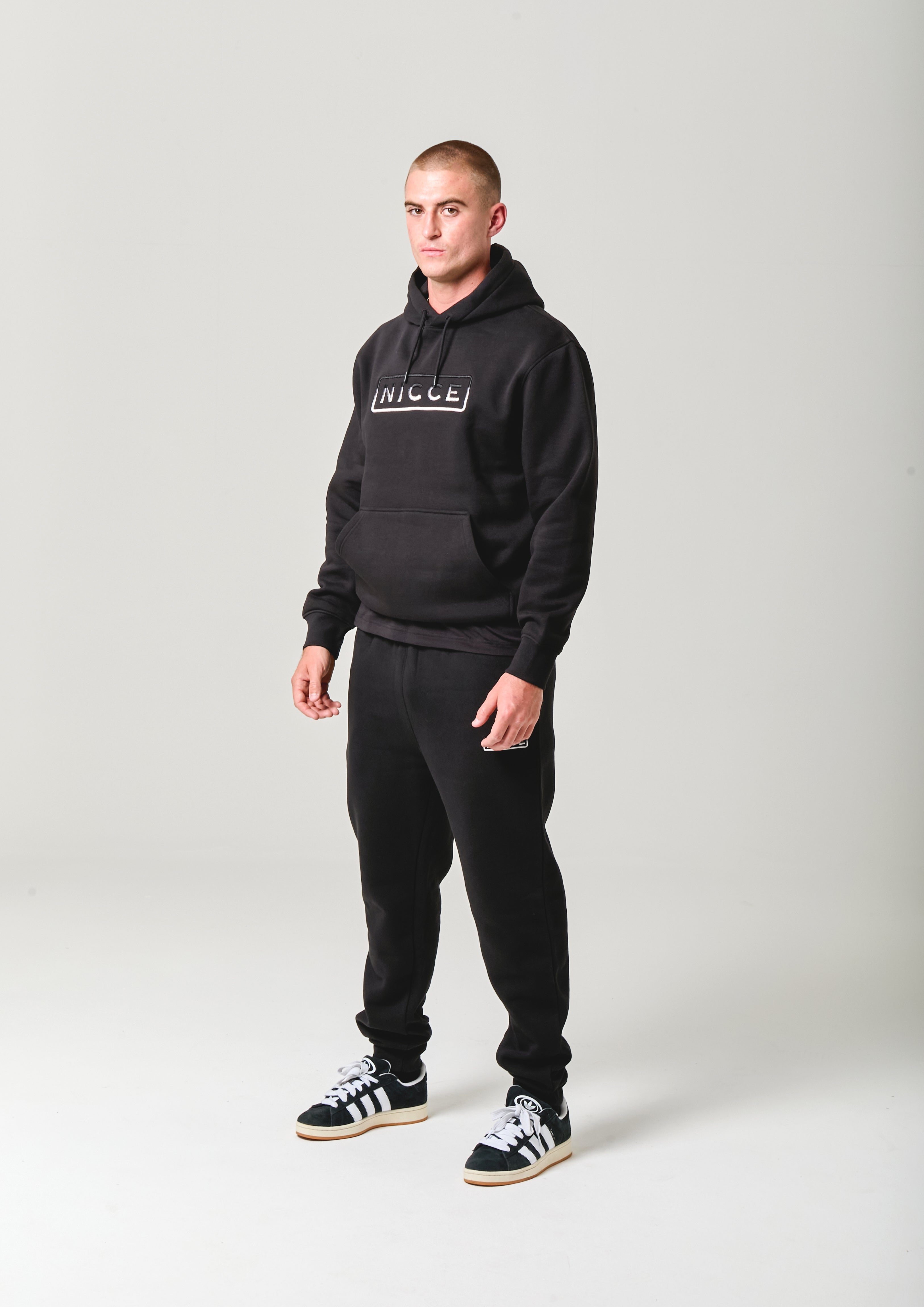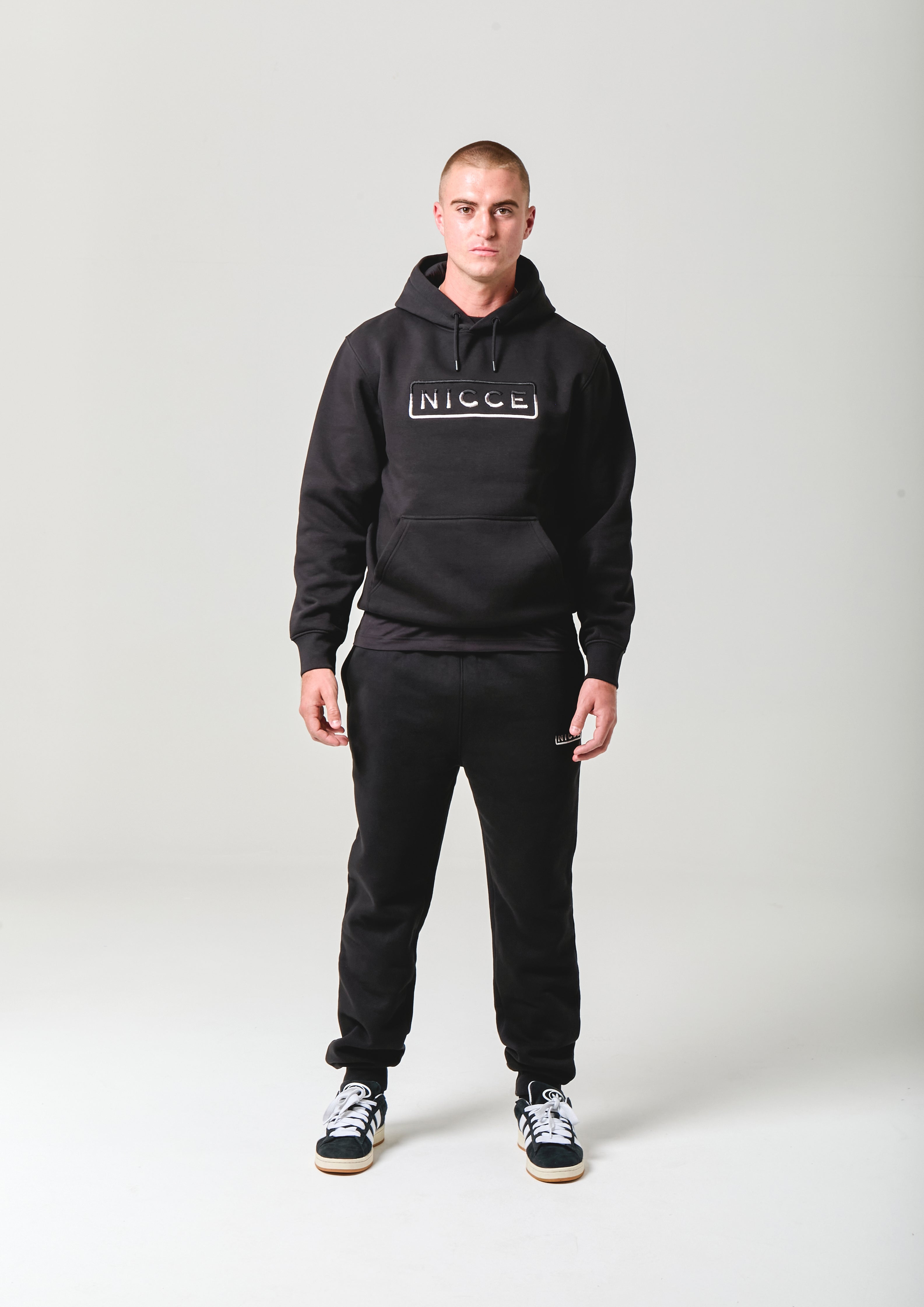 The Powell Hoodie & Jogger Set in Black features a raised embroidered NICCE logo across the hoodie chest with a subtle gradient effect. The hoodie comes with an adjustable drawstring hood, elasticated cuffs, and a structured waistband, while the joggers are designed for a comfortable, secure fit.