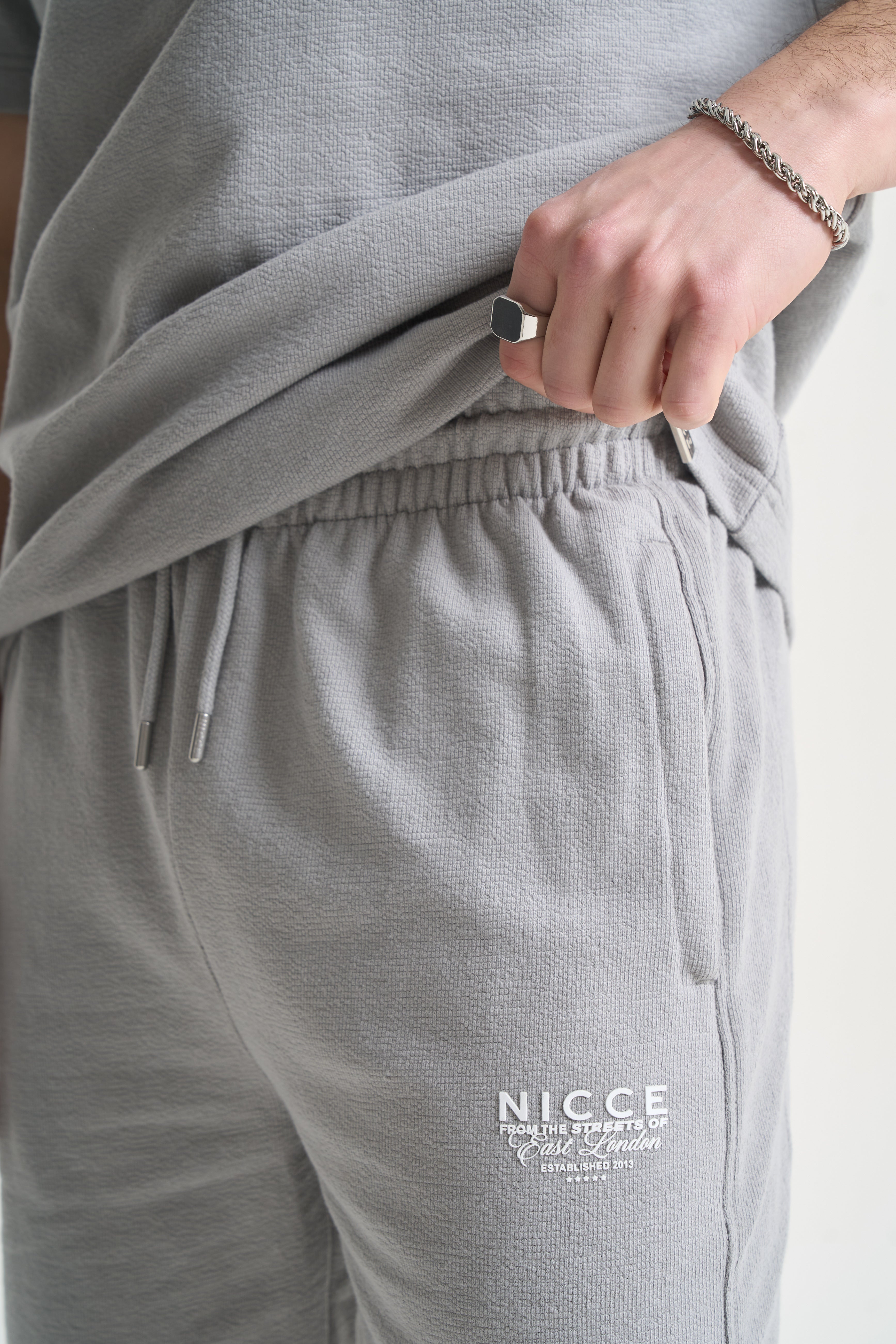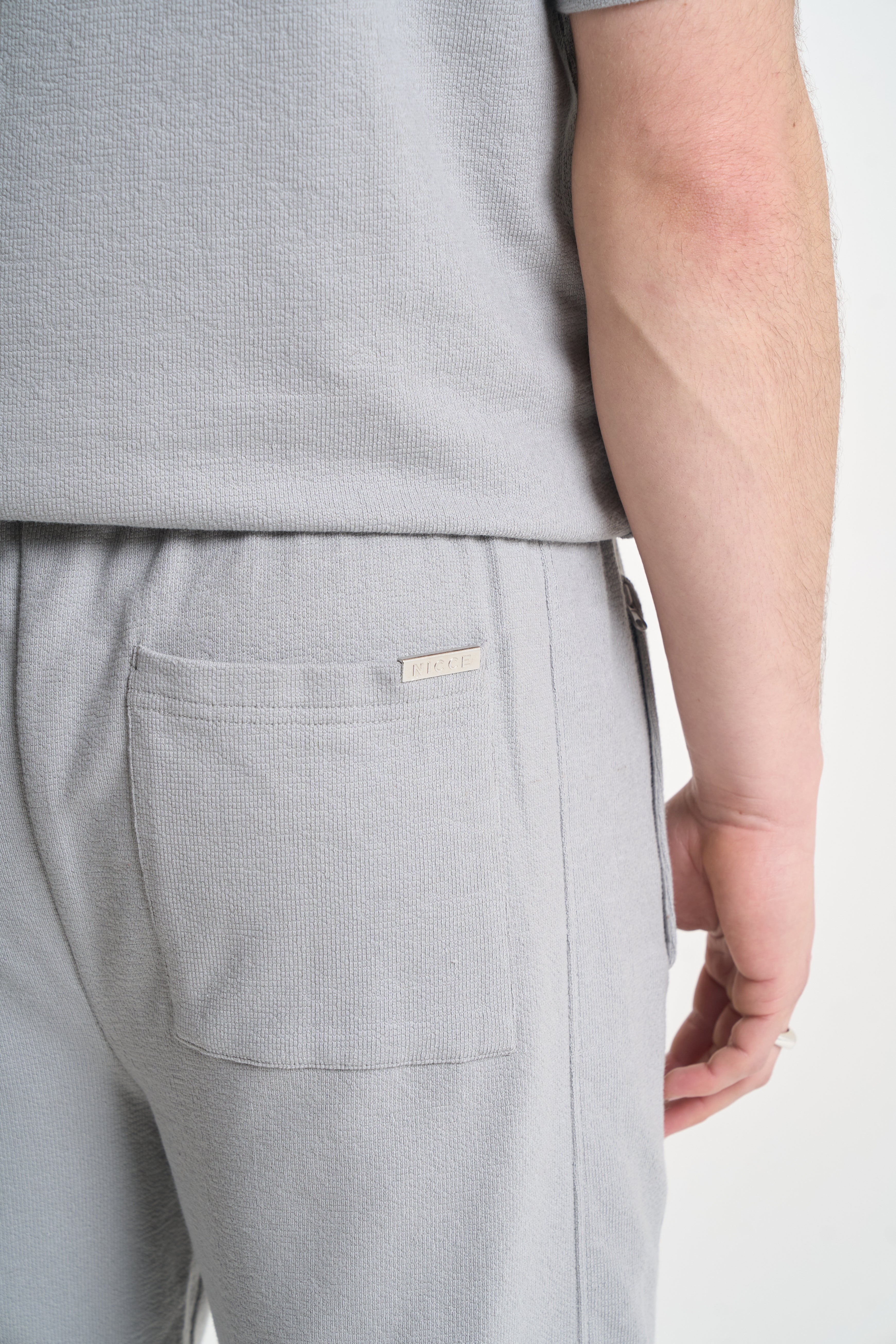 The Cera Textured T-Shirt and Shorts Set in Circular Grey is designed for warm days and relaxed wear. The T-shirt is made from textured cotton jersey, with a soft, structured feel, subtle chest branding, and a bold back print. The matching shorts feature a relaxed fit and clean lines for easy movement.