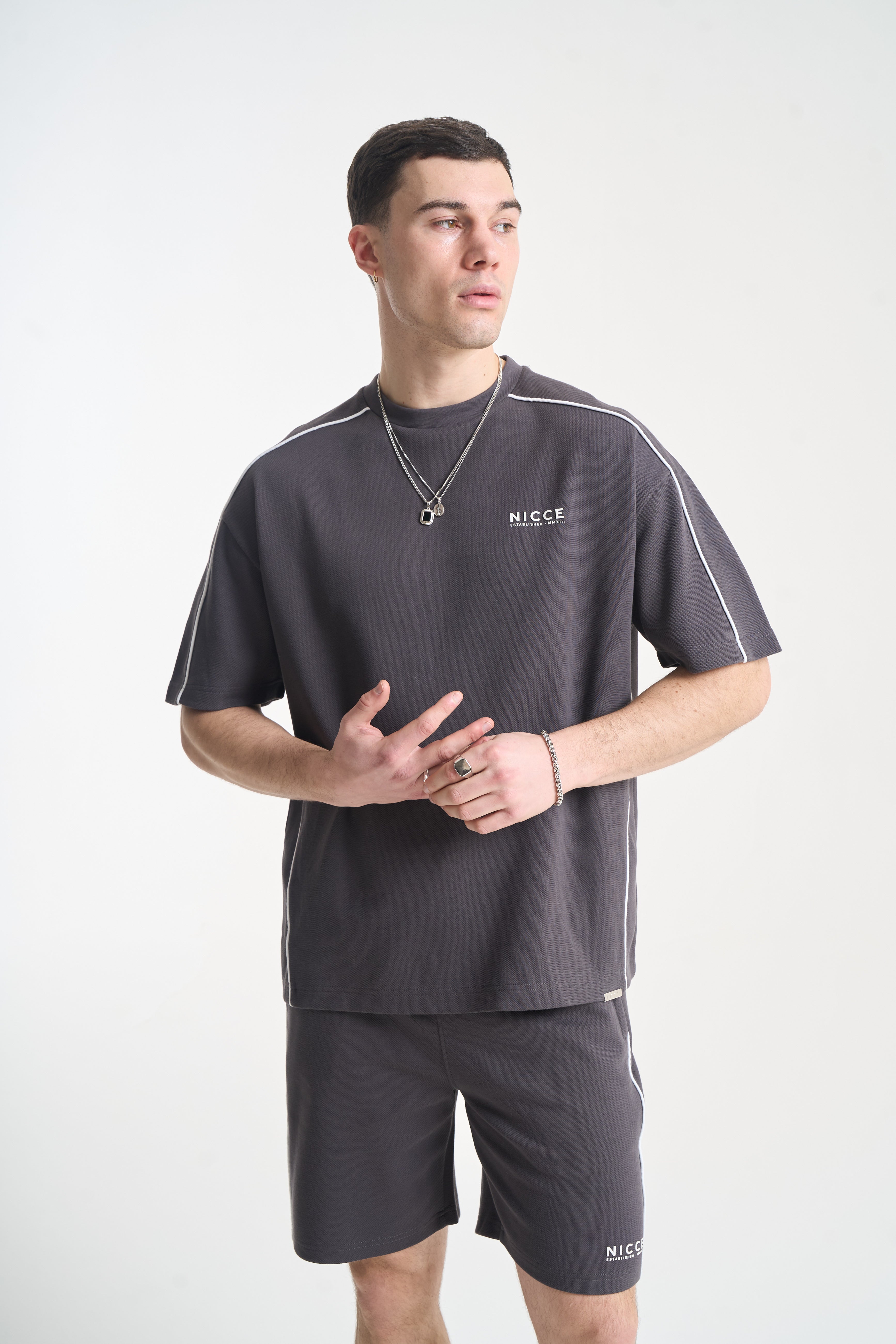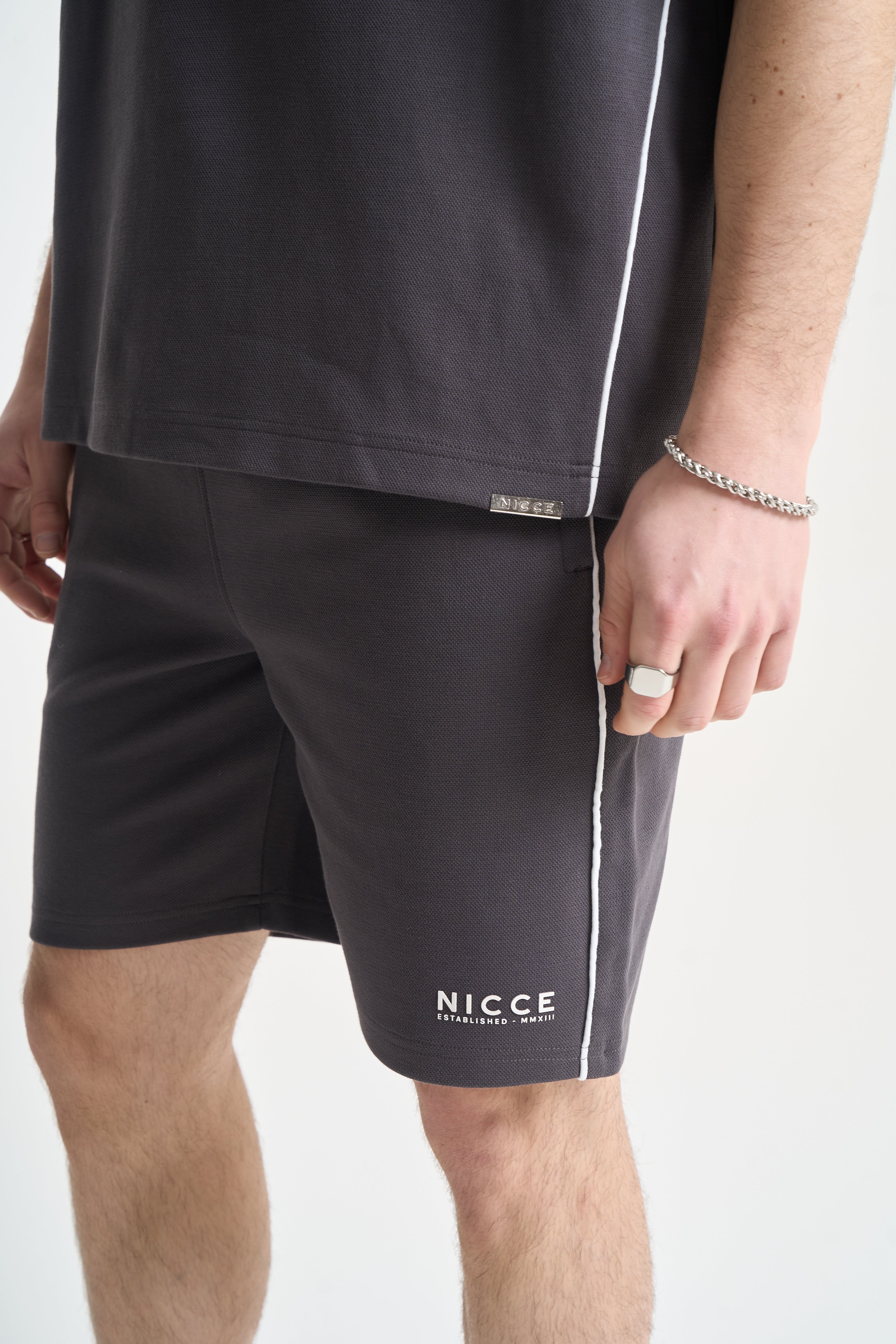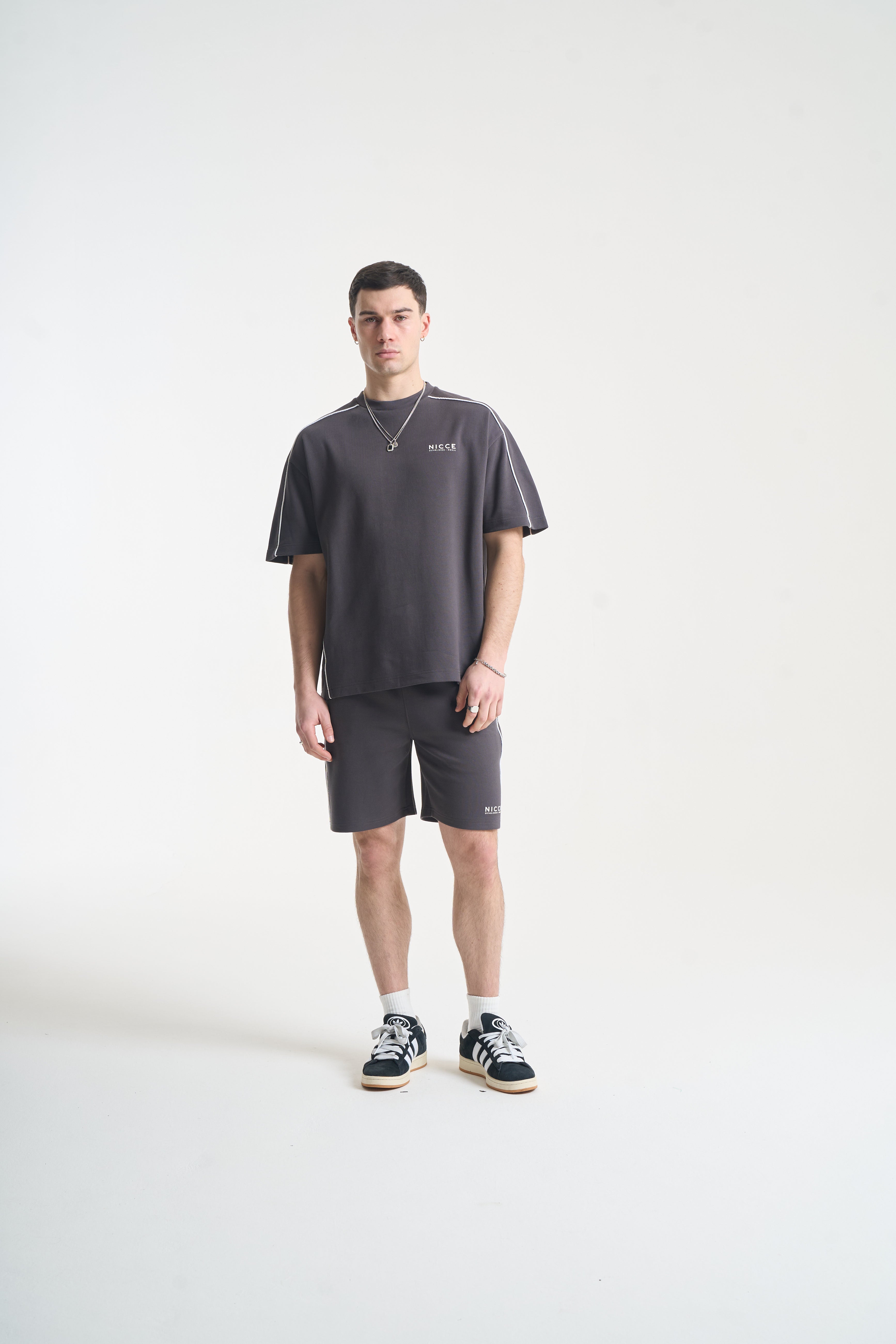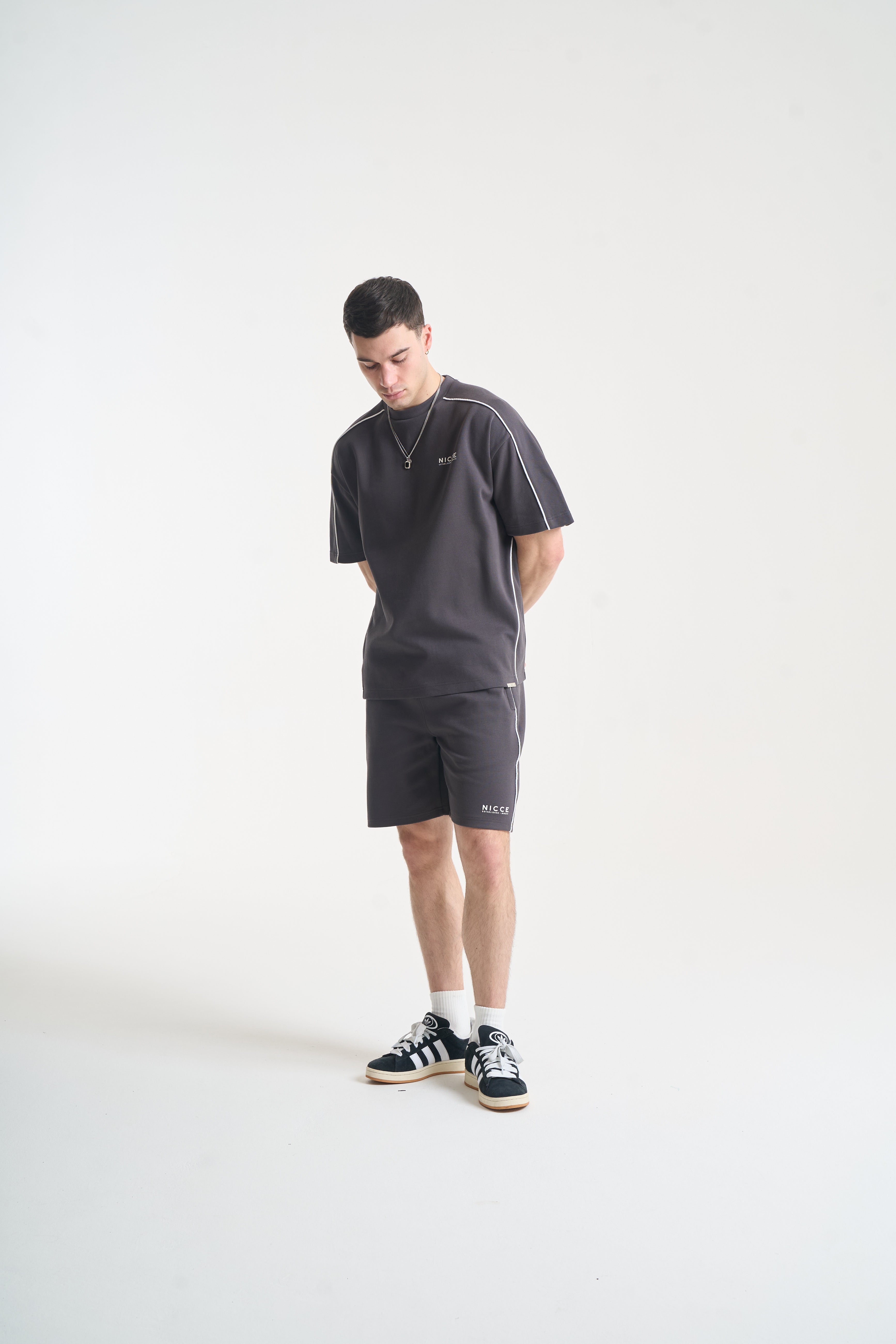 The NICCE Piper Top and Shorts Set in Coal combines relaxed comfort with clean streetwear style. The top features crisp white piping and subtle front branding, crafted from soft, durable fabric for all-day wear. The matching shorts share the same attention to detail, with coordinating piping, branding, and a relaxed fit for effortless movement.