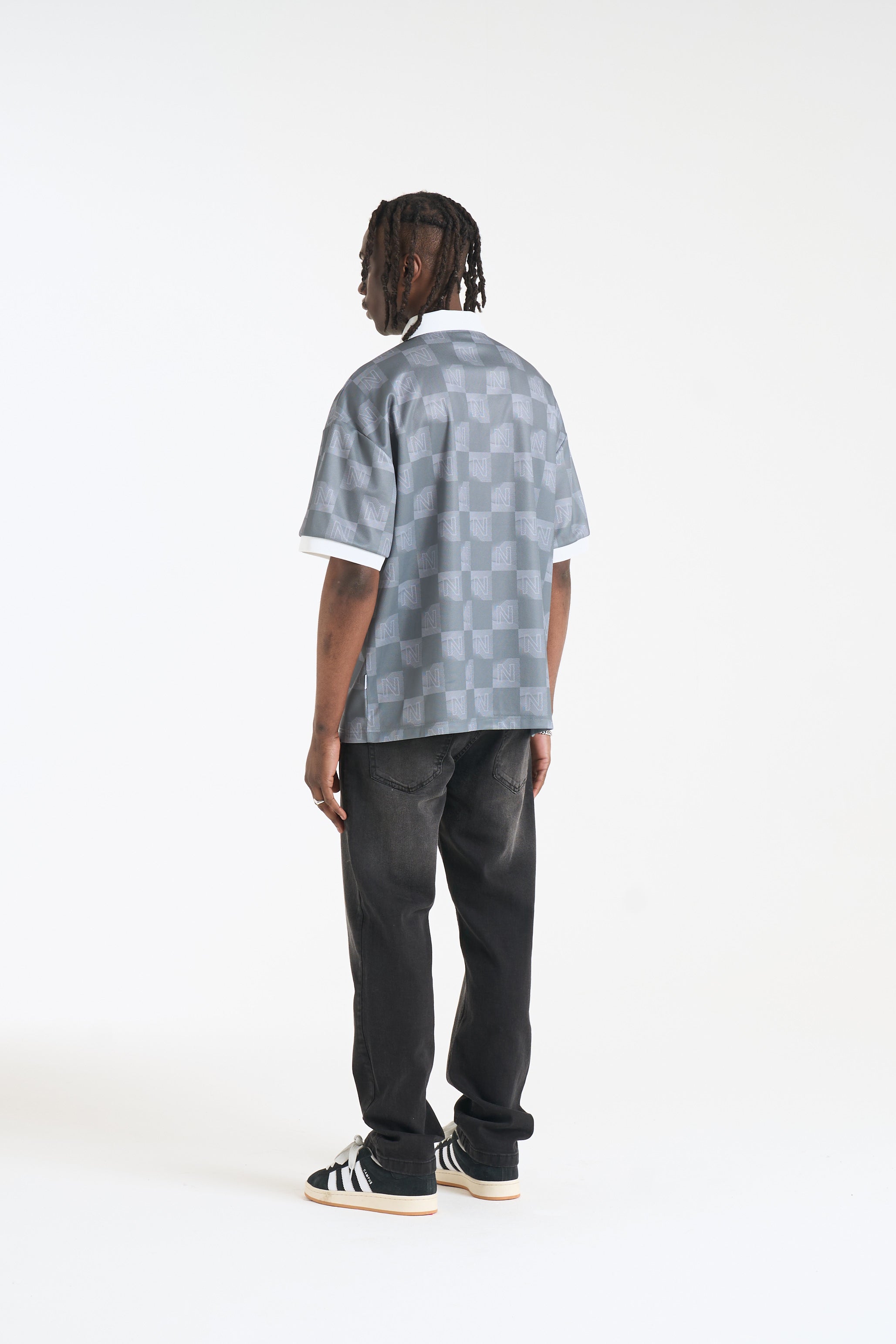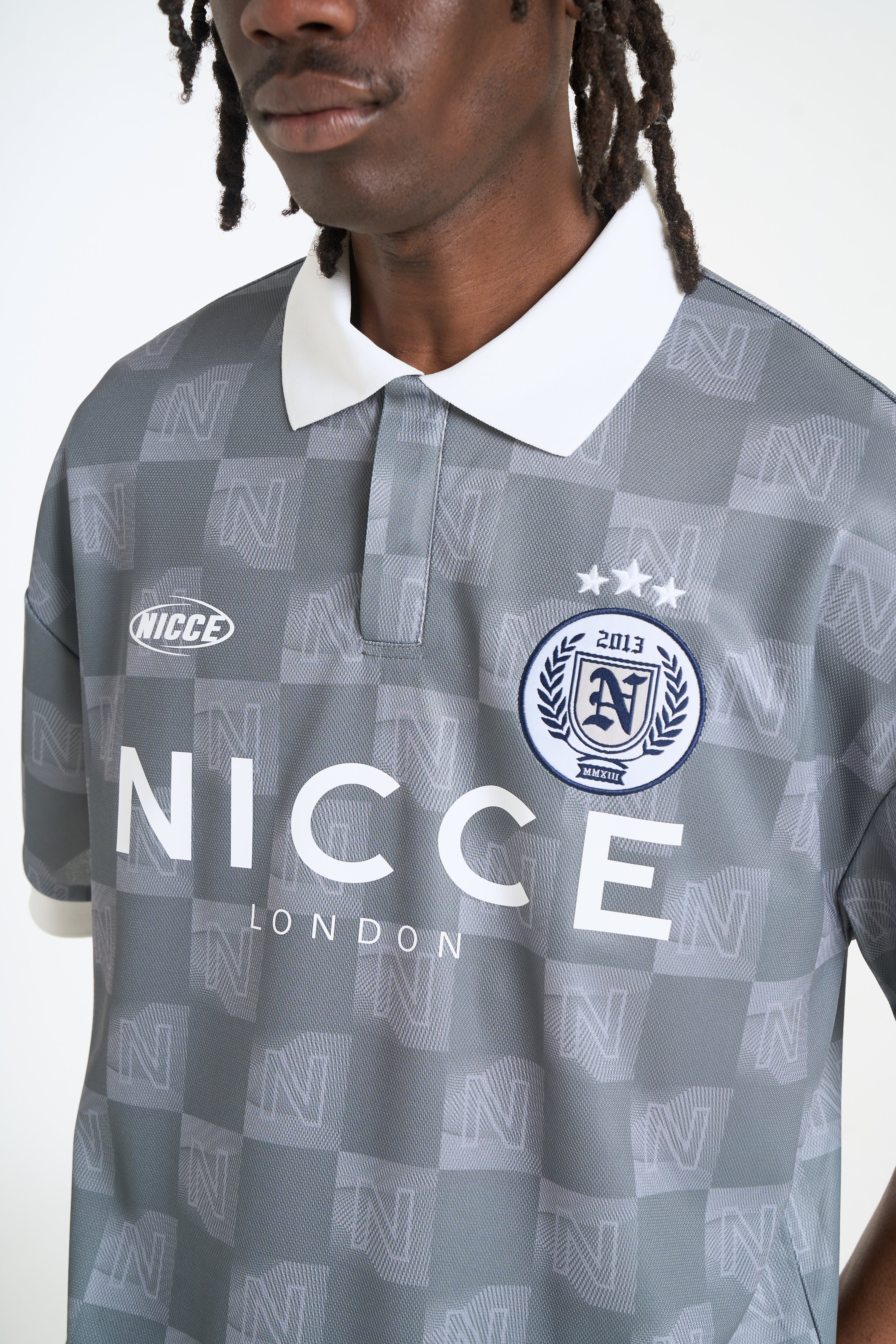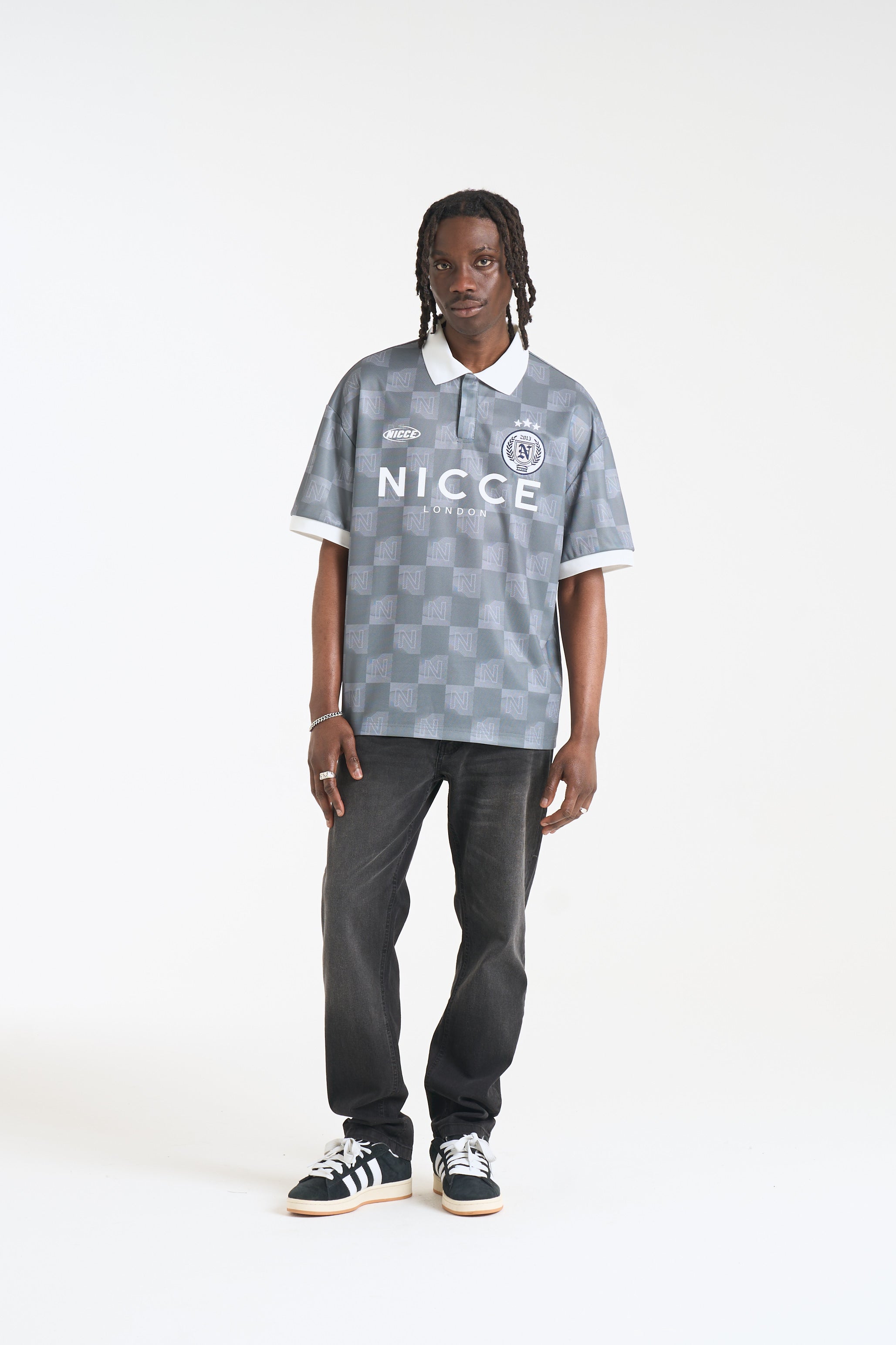 The NICCE Staduim Football Shirt delivers a clean, contemporary take on classic football styling. Designed in a muted grey tonal check pattern, it features a structured polo collar with a concealed placket for a refined finish. Bold NICCE London branding sits across the chest, complemented by a detailed crest badge and subtle logo hits for an elevated, sporty look. Easy to style with shorts, joggers, or denim for everyday wear.