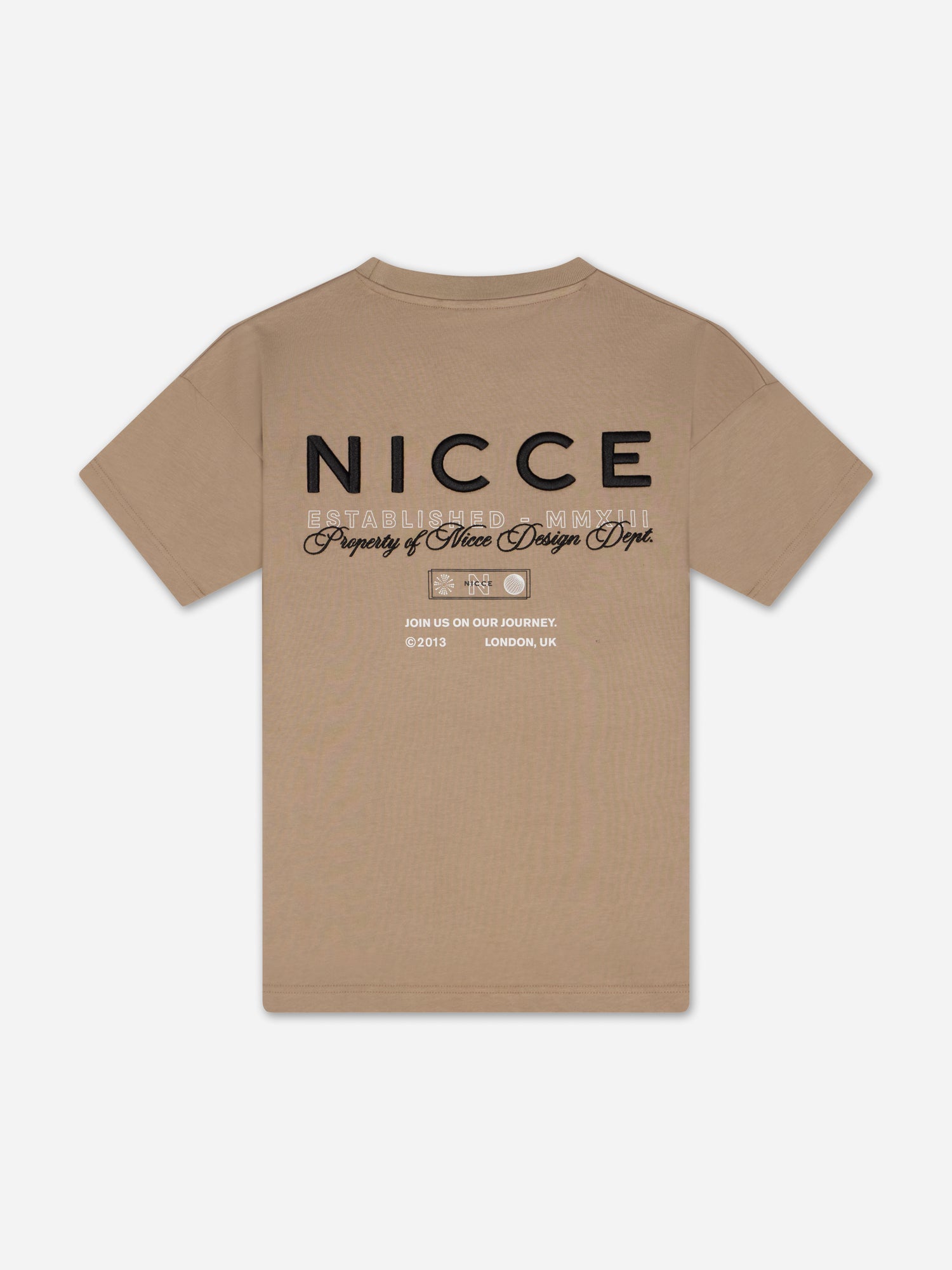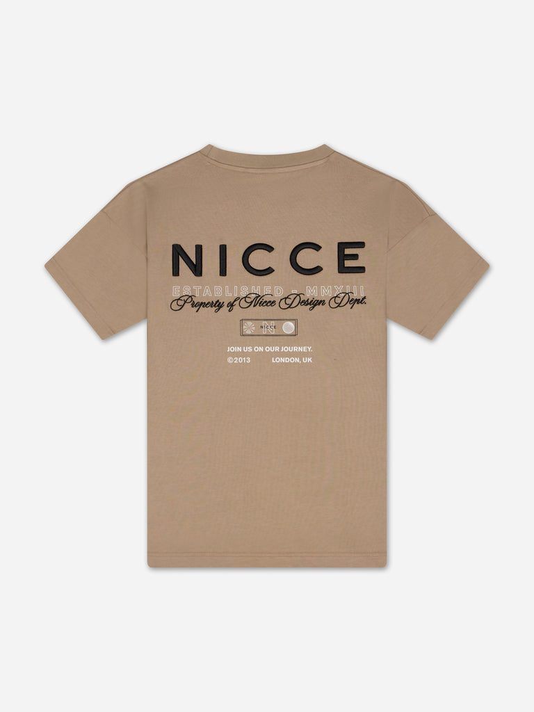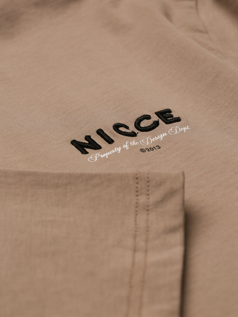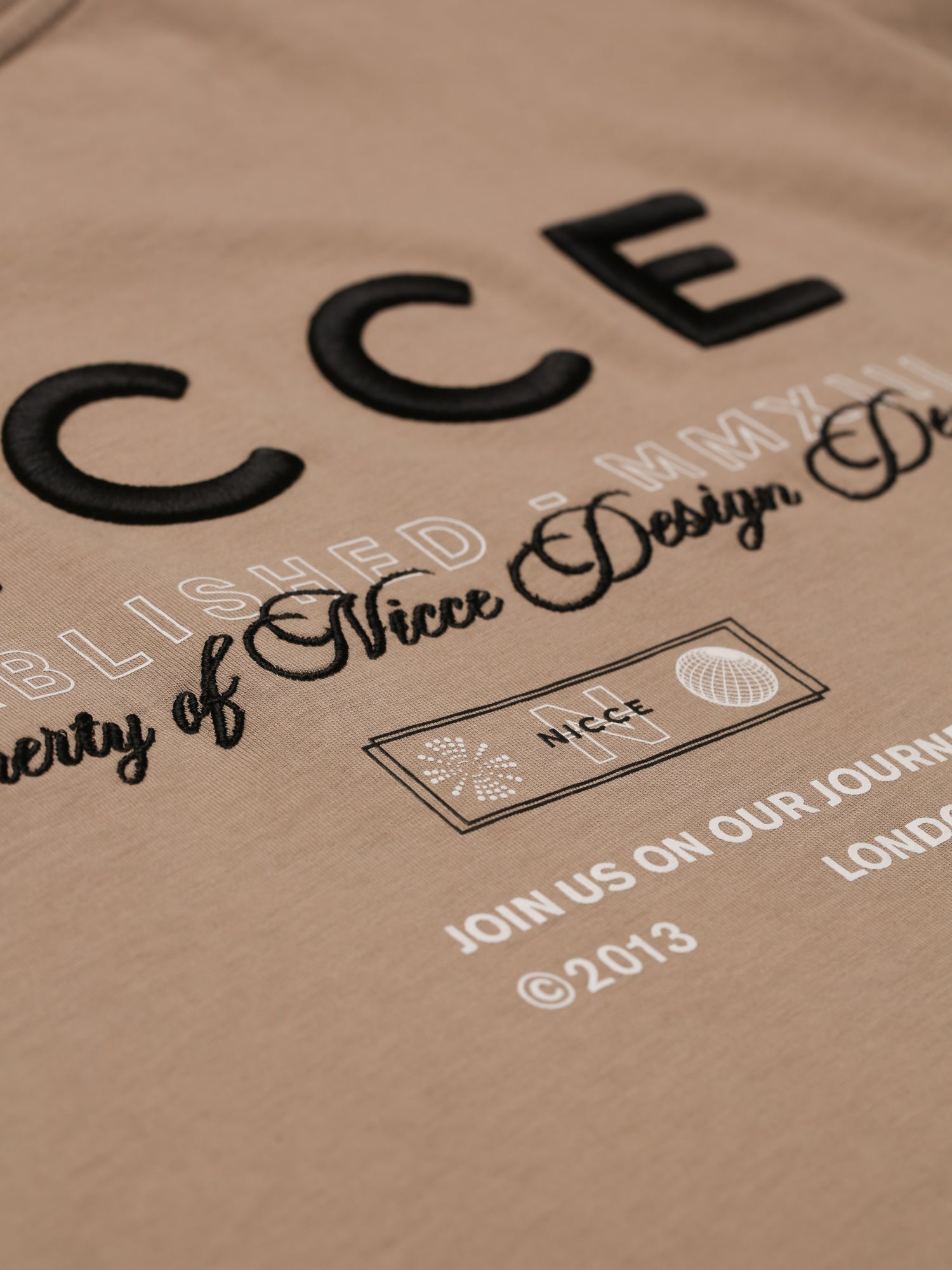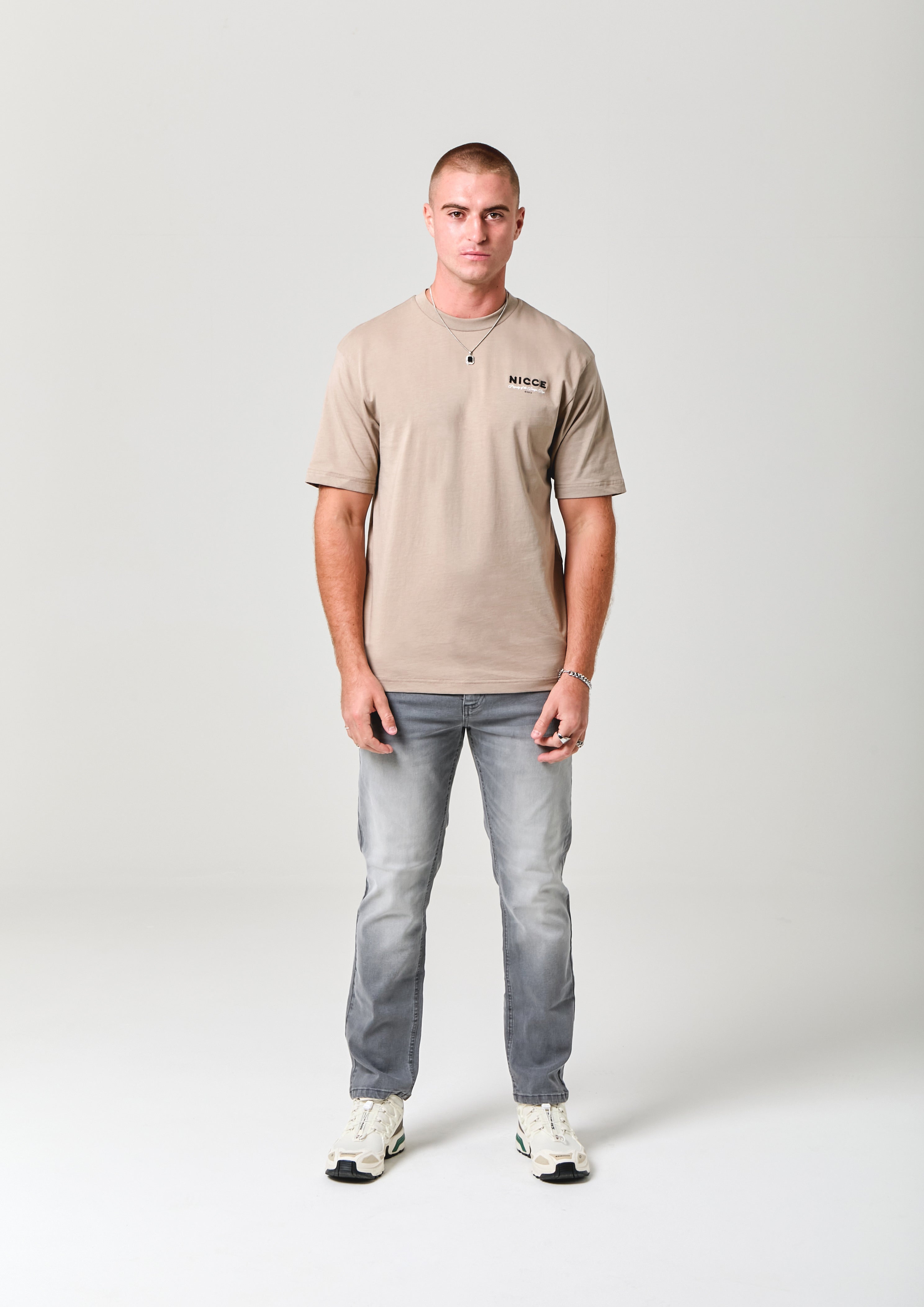 The NICCE Meridian T-Shirt in Taupe Zeal brings a laid-back, oversized fit with clean streetwear energy. A small front logo keeps it minimal, while the full back design—combining embroidery and print—adds standout detail without overdoing it.