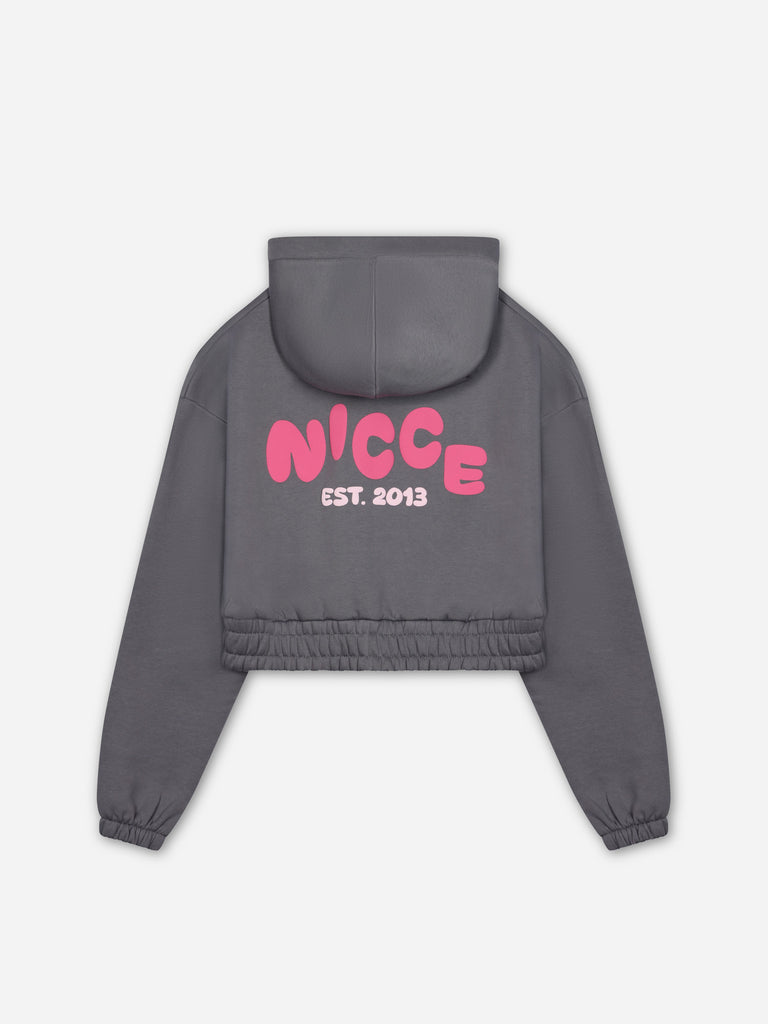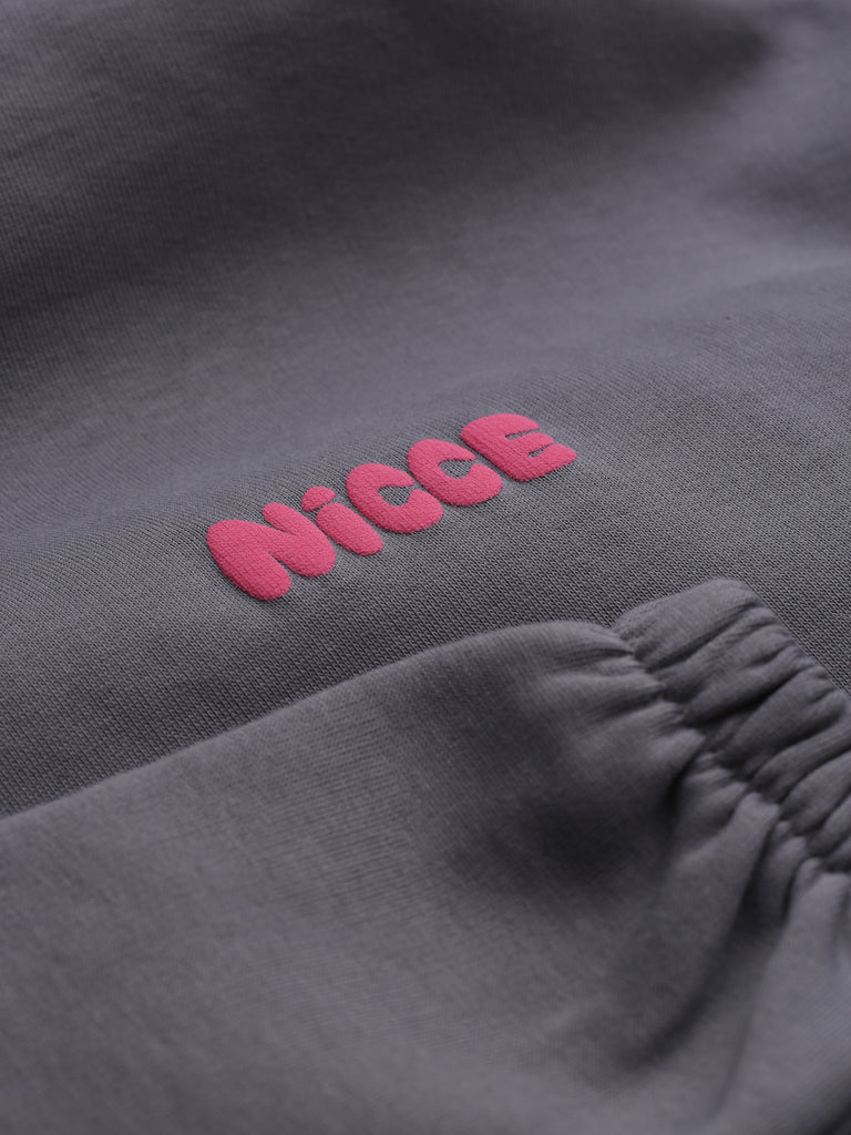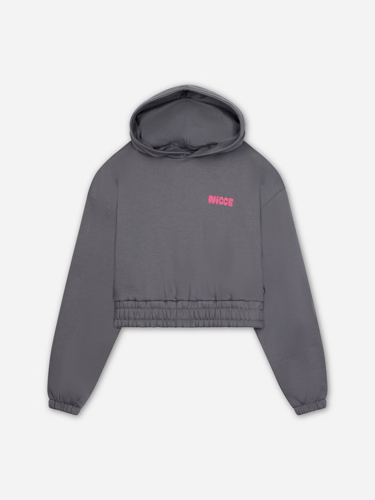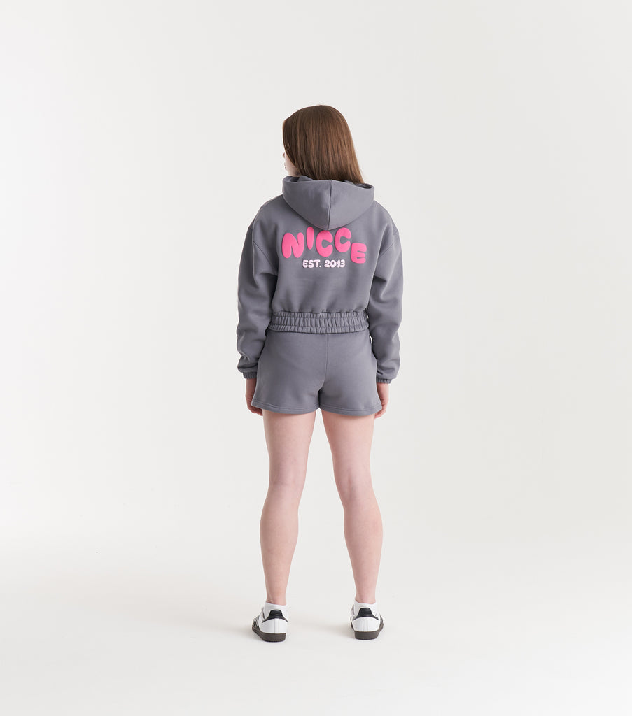 The NICCE Girls Sapphire Cropped Hoodie in charcoal brings bold streetwear flair with a small pink logo on the front and a large pink logo across the back. This hoodie combines comfort and style with its cropped cut, perfect for layering with our matching shorts. The contrast of the grey and pink adds an edgy yet playful vibe, making it a must-have for any girl's streetwear collection.