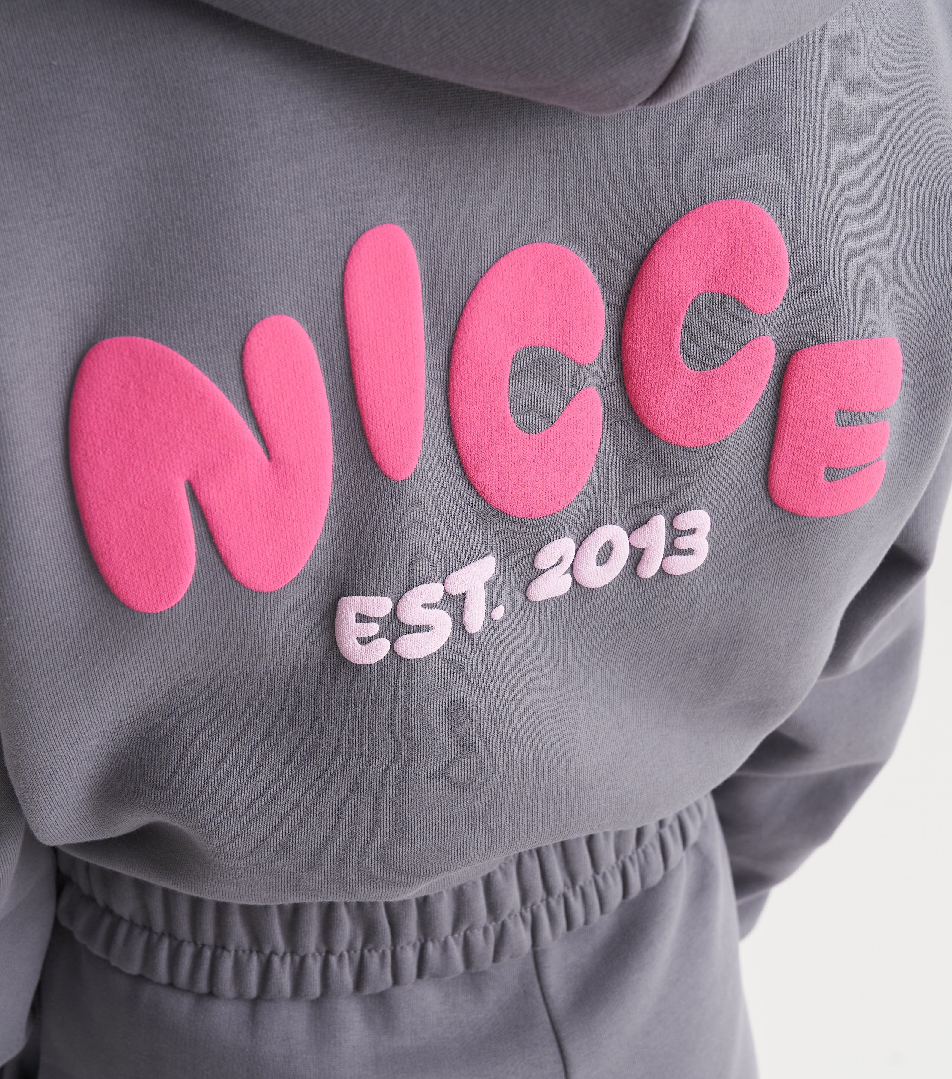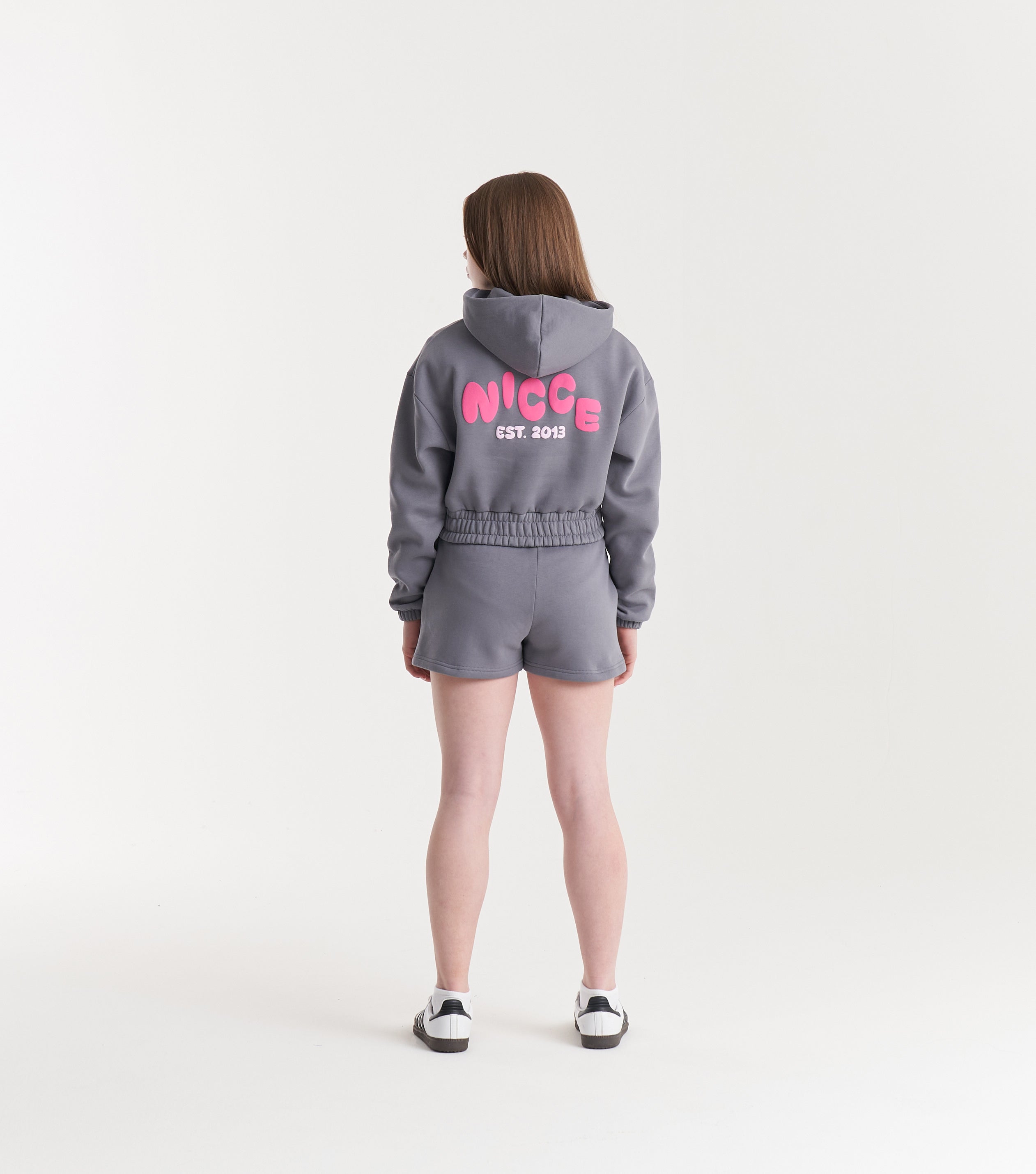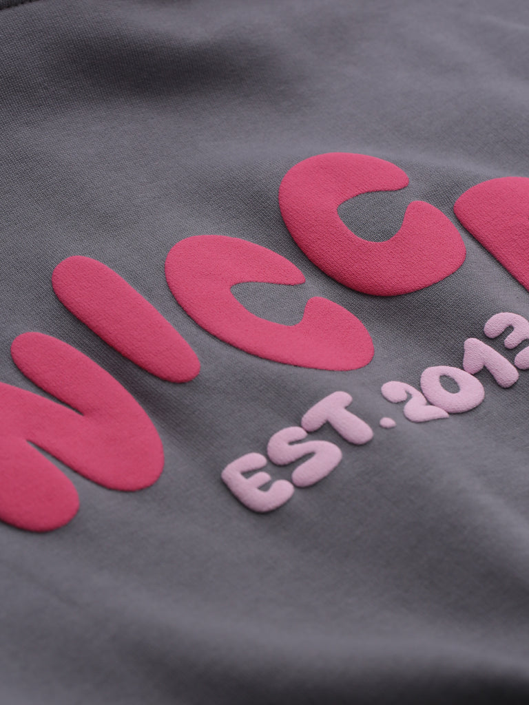 The NICCE Girls Sapphire Cropped Hoodie in charcoal brings bold streetwear flair with a small pink logo on the front and a large pink logo across the back. This hoodie combines comfort and style with its cropped cut, perfect for layering with our matching shorts. The contrast of the grey and pink adds an edgy yet playful vibe, making it a must-have for any girl's streetwear collection.